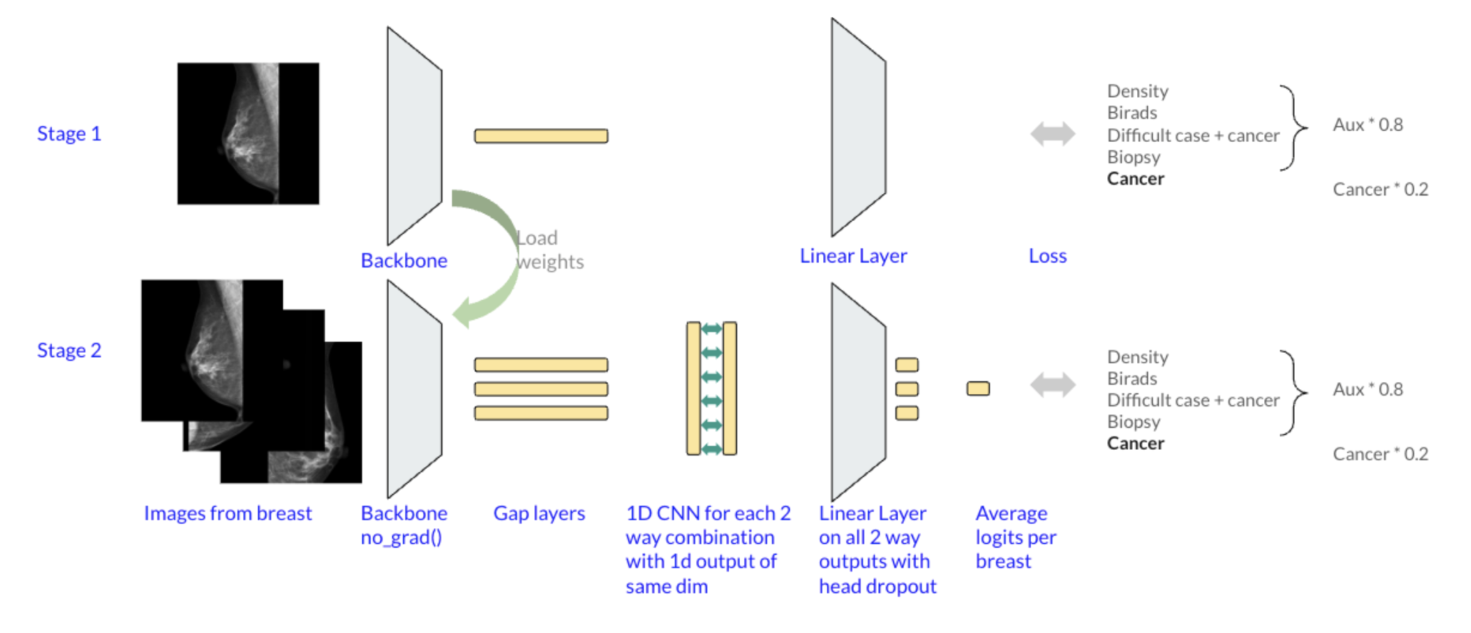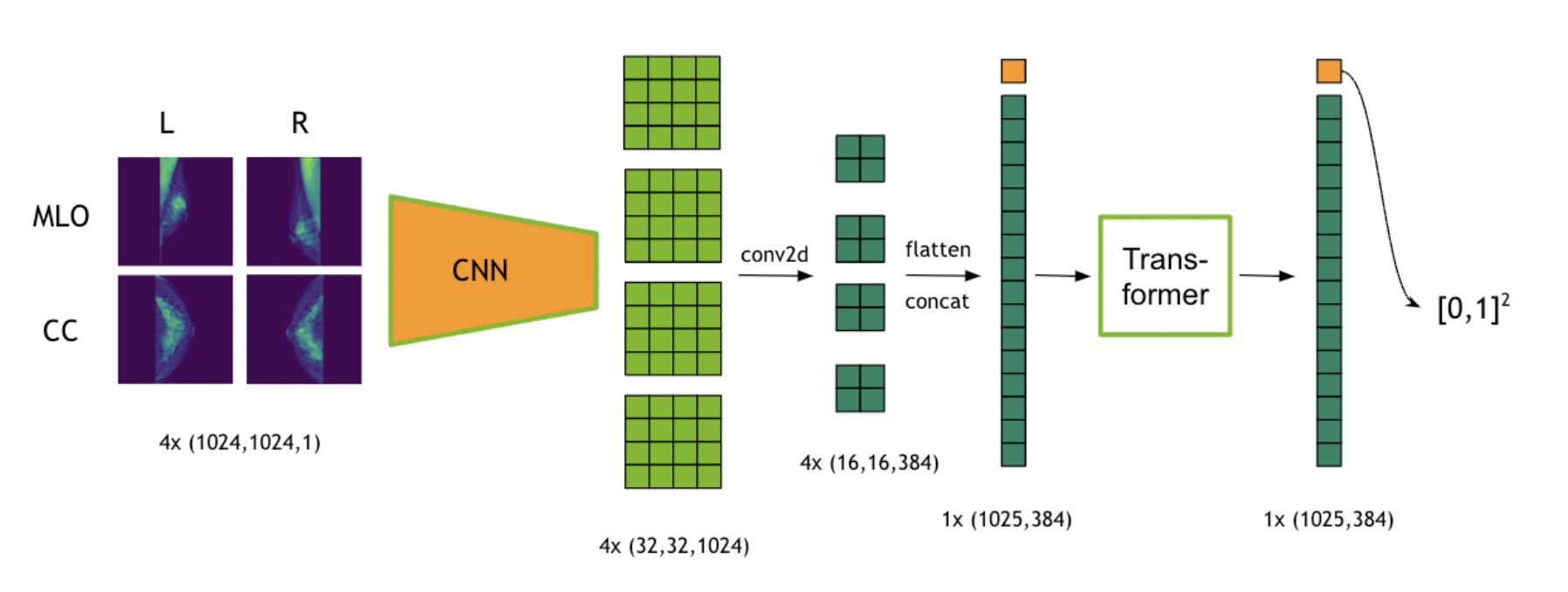 Conv1d(kernel_size=2, padding=0),输出为 M x dim,这 M 个向量特征既是这一组图片的深度特征,也能表达图片之间的关联性。 - 第三步获得的特征过一个全链接层,获得 M x 2 的输出,求均值后得到 (2, ) 的预测值,分别表示病人的左右乳房患病概率。